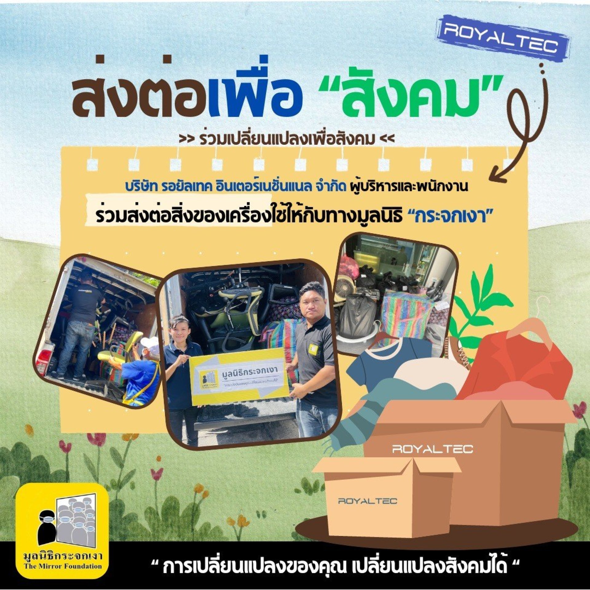 บริษัท รอยัลเทค อินเตอร์เนชั่นแนล จำกัด ขอเป็นส่วนหนึ่งเพื่อสังคม จัดกิจกรรม ส่งต่อเพื่อสังคม โดยมีผู้บริหารและพนักงาน ร่วมบริจาคสิ่งของ ให้กับมูลนิธิกระจกเงา ส่งต่อสิ่งของเครื่องใช้ จำเป็น หนังสือ เสื้อผ้า ของใช้ทั่วไป เฟอร์นิเจอร์ ฯลฯ