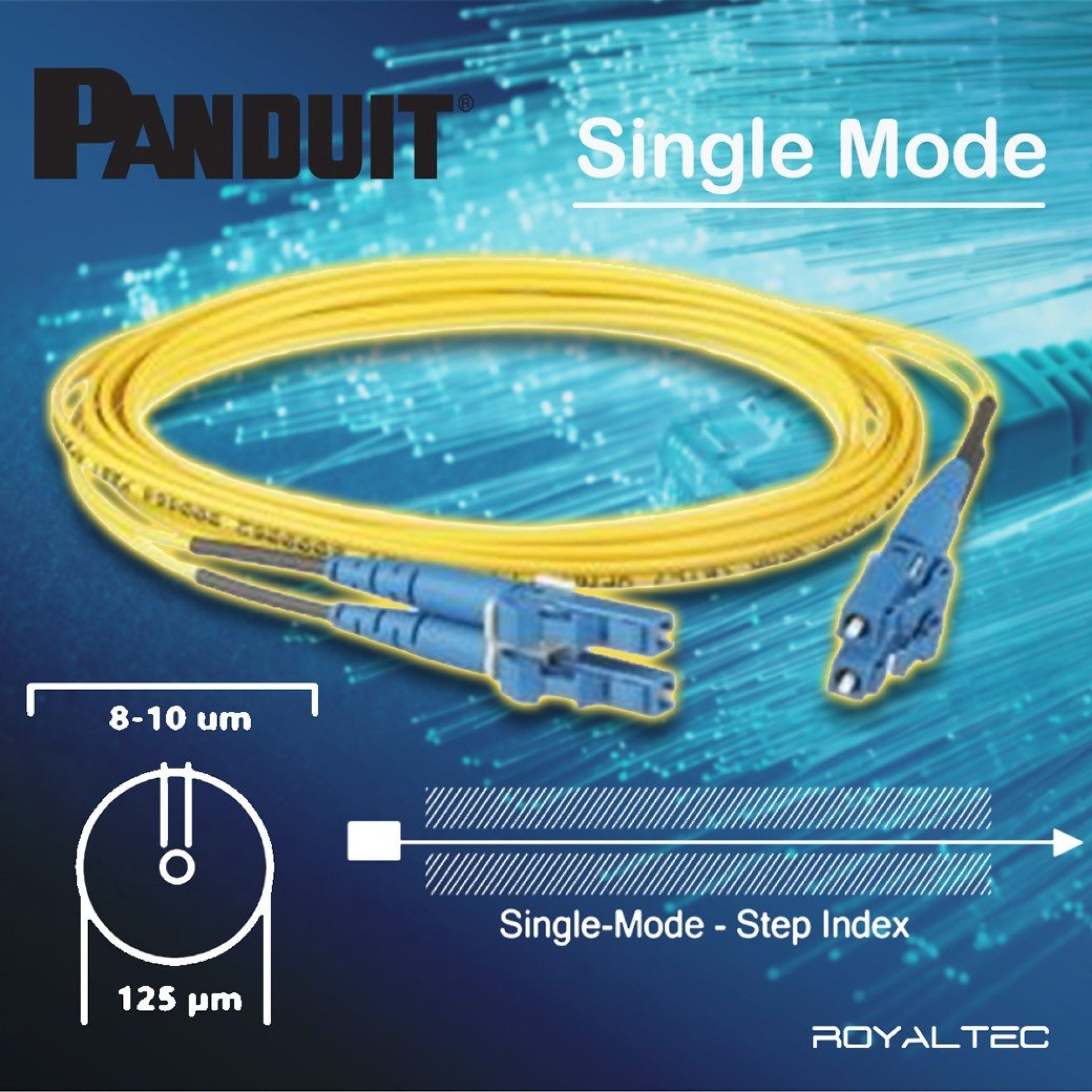 - Single-Mode(ตัวย่อSM) ถูกออกแบบมาเพื่อนำแสงเดินทางเป็นทางตรงในระยะทางที่ไกล (ส่งสัญญาณแบบ Lasor) ความเร็วสัญญาณที่รองรับ 10Mbps, 100Mbps ไปจนถึง 1Gbps (ตัวส่งบางชนิดสามารถส่งได้ถึง 10gb) ระยะทางเดินสามารถเดินได้ถึง 10km (ตามมารตราฐาน) หรือมากกว่าขึ้นอยู่กับตัวส่งสัญญาณ Single-mode ได้แบ่งย่อยได้ 2 ประเภท คือ ชนิด OS1 และ OS2 ซึ่งปัจจุบันจะนิยมเป็น OS2